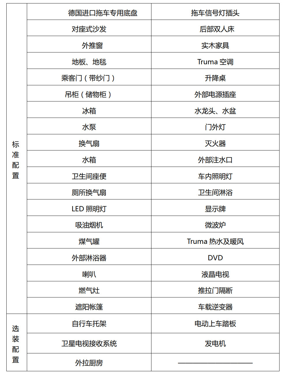 2.0T拖挂式旅居车配置表(HCC9022XLJ)